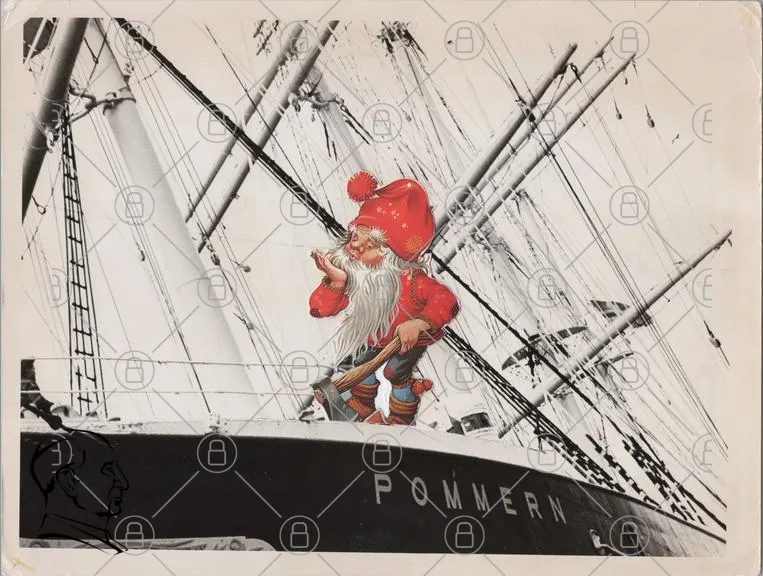 tomte, båt, Pommern, segel, sjöfart, jul, tradition, illustration, röd hatt, skägg, maritim, nostalgi, konst, vintage, hav, äventyr, kultur, nordisk, figur, dekoration, historia, sjöman, vinter, snö, landskap, gammal, svartvitt, detaljer, hantverk, symbol