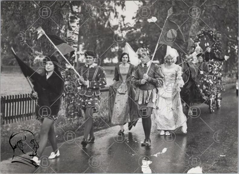 parad, kostymer, flaggor, historiska, kläder, fest, tradition, människor, dans, kultur, svartvitt, 1900-tal, festligheter, tåg, evenemang, utklädnad, folklig, samling, glädje, gemenskap, festlig, dekorationer, musik, dansare, festligheter, gator, natur, träd, regn