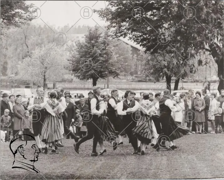 dans, folkdans, tradition, kostymer, fest, utomhus, träd, publik, svartvitt, kultur, samling, glädje, rörelse, historisk, evenemang, landskap, gemenskap, musik, dansare, kläder, folklor, festligheter, 1900-tal, socialt, aktivitet, natur, samvaro, minnen, festlig