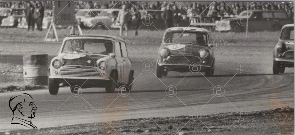 racing, bilar, klassiska, Mini, motorsport, tävling, svartvitt, kurva, publik, 1960-tal, retro, hastighet, bilsport, förare, motor, väg, rally, sportbil, tävlingsbilar, bilracing, vintage, körning, bana, adrenalinkick, bilentusiaster, motorer, racingevent, bilkultur, historisk