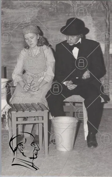 svartvit, gammaldags, kvinna, man, kläder, bänk, hink, scen, teater, kostym, förkläde, huvudbonad, sittande, inomhus, trä, traditionell, uttryck, rekvisita, historisk, drama, rollspel, 1900-tal, porträtt, samspel, miljö, kultur, stil, vintage, skådespelare, folkliv