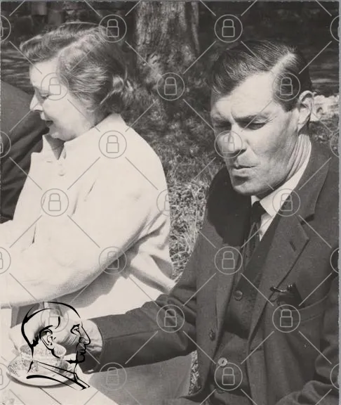 svartvitt, foto, man, kvinna, utomhus, 1950-tal, kläder, leende, natur, trä, sällskap, mat, dryck, nostalgisk, ansiktsuttryck, socialt, samvaro, historisk, vintage, tradition, familj, vänskap, glädje, minnen, avslappnad, interaktion, kultur, tidsepok, livsstil, fotografi