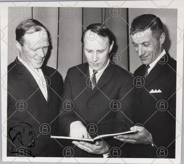 svartvit, män, kläder, kostymer, bok, diskussion, 1950-tal, porträtt, affärsmän, möte, leende, fotografi, historiskt, grupp, presentation, dokument, kontor, professionellt, ansikten, interaktion
