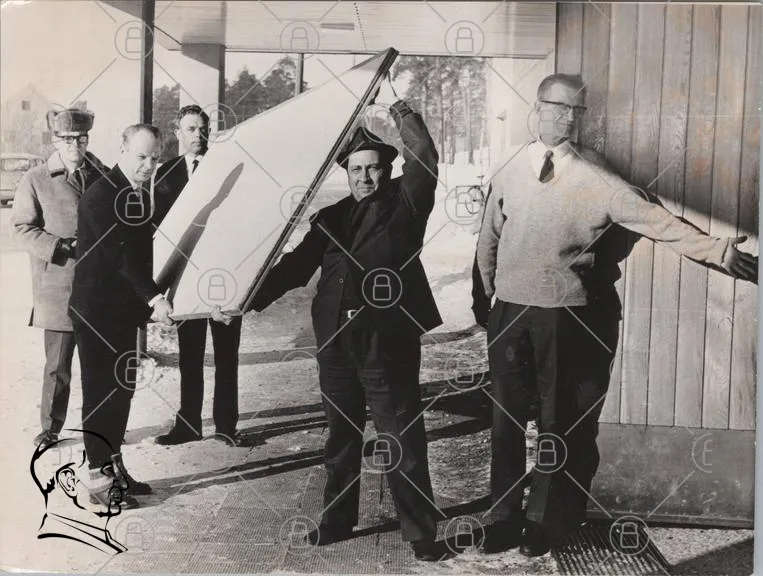 historisk, svartvit, män, byggnad, presentation, skylt, vinter, hatt, kostym, glas, trä, 1960-tal, grupp, arbete, teknik, arkitektur, utomhus, fotografering, tradition, samarbete, projekt, design, innovation, föreställning, stil, miljö, landskap, kultur, samhälle, evenemang