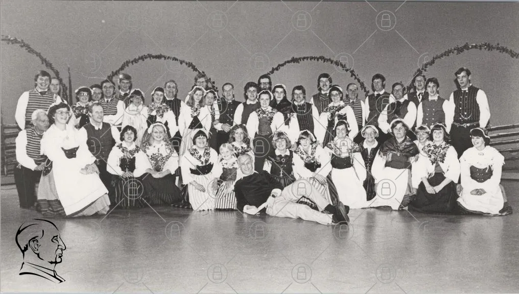 dans, folkdans, kostymer, gruppfoto, svartvitt, traditionell, uppträdande, kultur, fest, glädje, samhörighet, musik, scen, dansare, kläder, leenden, gemenskap, föreställning, artister, bakgrund, dekorationer, historisk, evenemang, dansgrupp, folkloristisk, presentation, danssteg, samling, festligheter, traditioner