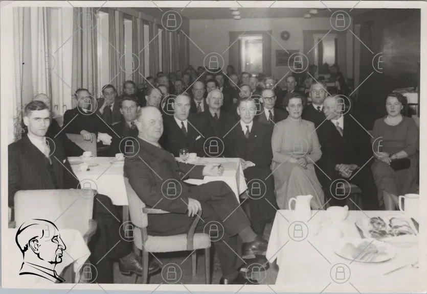 möte, konferens, män, kvinnor, kostymer, 1950-tal, svartvitt, bord, kaffe, te, stolar, fönster, gruppfoto, affärsmän, diskussion, formell, inomhus, samling, kläder, ansikten, professionell, traditionell, interiör, evenemang, samhälle, historia, representation, organisation, ledarskap