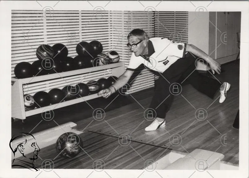 bowling, man, bowlingkula, bowlinghall, sport, retro, svartvitt, trä, kläder, glasögon, aktivitet, bana, bowlingutrustning, 1900-tal, hobby, underhållning, socialt, tävling, precision, teknik