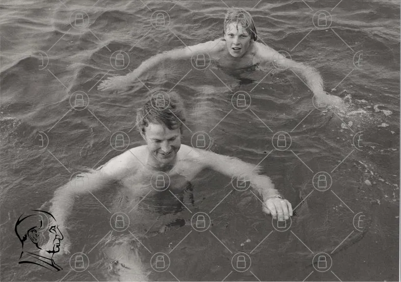 simma, män, vatten, svartvitt, bad, sommar, nöje, vänner, avslappning, natur, sjö, kropp, ansikten, glädje, aktivitet, utomhus, sport, ungdomar, fotografi, retro, 1970-tal, fritid, skratt, simning, kamratskap, minnen, livsstil, hälsa, motion, vattenlek