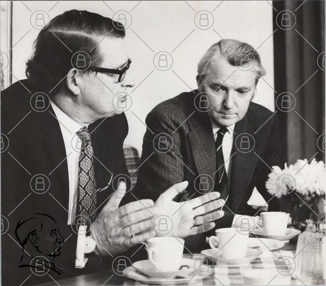 svartvitt, män, samtal, kaffe, bord, blommor, slips, kostym, 1970-tal, diskussion, te, koppar, mönstrad duk, allvarliga ansikten, interaktion, socialt, vintage, retro, stil, uttryck, gestikulera, sittande, inomhus, fotografi, dokumentär, historisk, relationer, affärsmöte