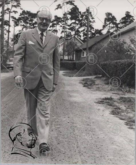 man, kostym, glasögon, promenad, gata, träd, hus, svartvitt, 1960-tal, stil, skratt, elegant, landskap, asfalt, skor, by, natur, svensk, vintage, fotografi, människa, kläder, gatan, omgivning, traditionell, tidlös, personlig, uttryck, social, avkoppling