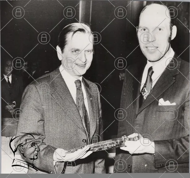 svartvitt, foto, män, handskakning, ceremon, pris, presentation, kostymer, leende, 1900-tal, affärsmän, formell, evenemang, historia, dokument, platta, medalj, utmärkelse, samarbete, vänskap