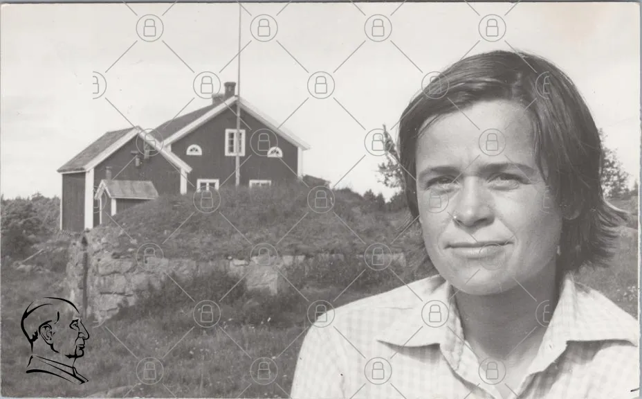 kvinna, svartvitt, porträtt, hus, landskap, natur, gräs, flaggstång, kläder, ansiktsuttryck, fotografi, 1900-tal, utomhus, svensk, traditionell, enkel, bakgrund, sommar, historia, kultur, person, kvinna i fokus, gammal bild, vintage, nostalgi, landsbygd, hem, familj, minnen