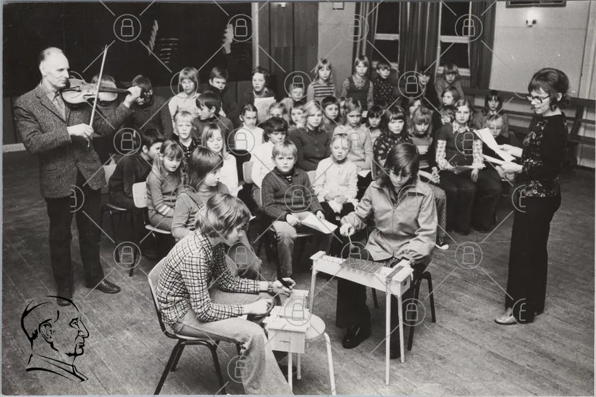 barn, musik, klassrum, instrument, orkester, uppträdande, 1970-tal, elever, lärande, samarbete, träning, notblad, koncentration, grupp, skola, tradition, kultur, kreativitet, undervisning, gemenskap, aktivitet, föreställning, pedagogik, barnmusik, repetition, samling, ungdomar, klasskamrater, lärarassistent, övning, gemensam