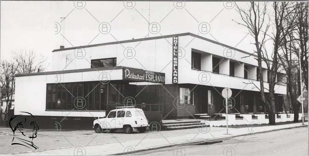 hotell, Esplanad, restaurang, byggnad, svartvit, 1960-tal, arkitektur, vägskylt, bil, entré, fönster, trottoar, stadsmiljö, retro, design, hotellverksamhet, matställe, parkering, fasad, modernism, historia, turist, resande, service, utomhus, landskap, kultur, samhälle, offentlig byggnad, reklam, skyltar