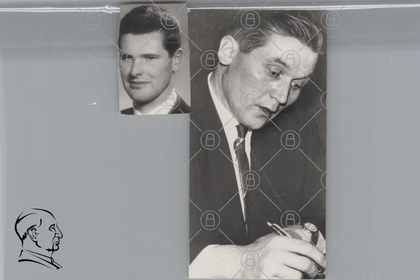 porträtt, svartvitt, man, skrivande, fotografi, ansikte, kläder, 1950-tal, vintage, dokument, penna, professionell, uttryck, stil, historia, gammal, bild, två personer, närbild, kontor, arbete