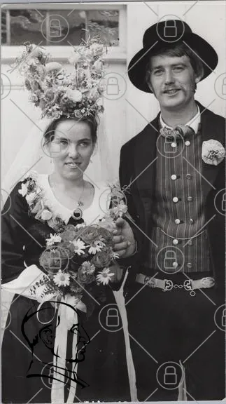 bröllop, par, traditionell, kläder, blommor, svartvitt, brud, brudgum, fest, kultur, kärlek, blomsterkrans, kostymer, romantik, fotografering, glädje, ceremoni, hand i hand, svensk, historisk, porträtt, bröllopsdag, festligheter, brudklänning, mansklädsel, bröllopstraditioner, brudbukett, festkläder, bröllopsfotografi, vintage