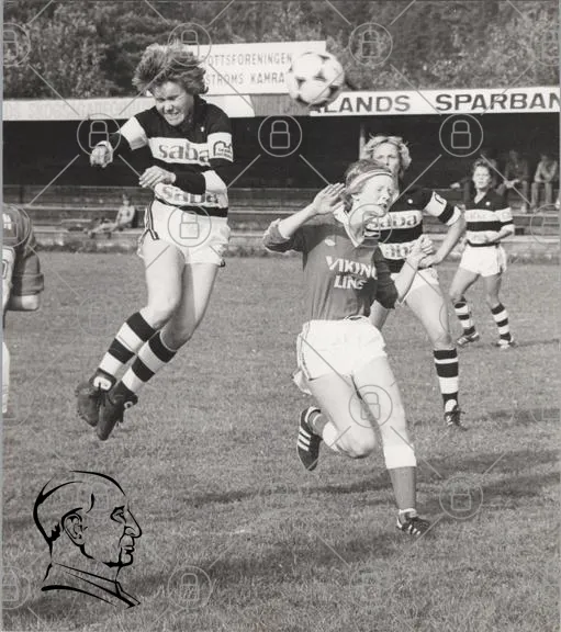 fotboll, kvinnor, sport, match, hopp, boll, lag, spelare, gräs, svartvitt, 1980-tal, träning, tävling, idrott, SABA, Viking Lines, fotbollsplan, publik, lagtröjor, kvinnlig idrott, fotbollsspelare, action, rörelse, teamwork, konkurrens, ungdomssport, fotbollsmatch, kvinnofotboll, sportevenemang, kamratanda