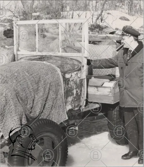 bil, gammal, vinter, snö, man, uniform, fönster, däck, last, landskap, trä, ruta, motor, transport, historisk, svartvit, fordon, täcke, lastbil, väg, natur, fotografering, retro, stil, säkerhet, övervakning, polis, kontroll, utomhus, traditionell