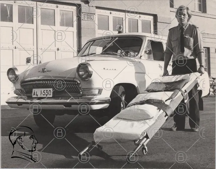 bil, gammal, svartvit, man, ambulans, bår, sjukvård, 1950-tal, EFK, registreringsskylt, AL 1530, gata, byggnad, uniform, historisk, transport, medicinsk, räddning, fotot, retro, fordon, stadsmiljö, person, hjälp, säkerhet, sjukvårdspersonal, nostalgi, klassisk, scen, utomhus