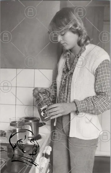 kvinna, kök, matlagning, kaffe, förpackning, vatten, kastrull, retro, svartvitt, kläder, hand, behållare, recept, hushåll, inredning, 1980-tal, vardag, livsstil, ingredienser, köksutrustning, fokus, aktivitet, hemlagat, tidlös, tradition, smak, njutning, dryck, förberedelse, enkelhet
