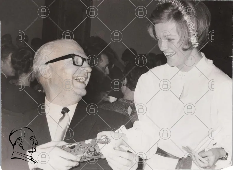 man, kvinna, leende, svartvitt, fest, reptil, skämt, glädje, kläder, glasögon, hårband, interaktion, publik, 1960-tal, fotografi, socialt, nöje, skratt, present, djur