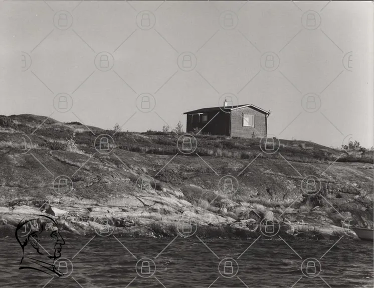 stuga, klippa, hav, vatten, landskap, natur, svartvit, ensamt, kust, sommar, fjärran, fönster, gräs, sten, himmel, horisont, avskildhet, lugn, stillhet, utsikt, ö, skärgård, byggnad, trä, landsbygd, enkelhet, ro, friluftsliv, semester, avkoppling, tradition