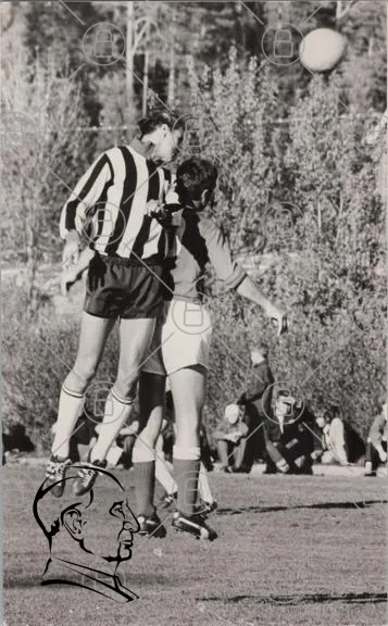 fotboll, spelare, hopp, match, sport, svart, vit, tröja, shorts, publik, gräs, tävling, 1960-tal, action, man, idrott, lag, mål, teknik, ungdom, utomhus, träning, rivalitet, fotografering, retro, nostalgi, motion, atletisk, prestation, energi