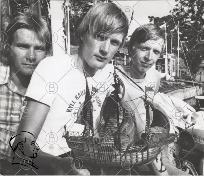 tre män, modellbåt, segelbåt, träbåt, hamn, sommar, svartvitt, vintage, marina, trä, hobby, vänner, leende, handarbete, segling, natur, träd, kläder, t-shirt, fotografi, nostalgi, 1970-tal, båtmodell, fritid, utomhus, manligt, gemenskap, tradition, hantverk