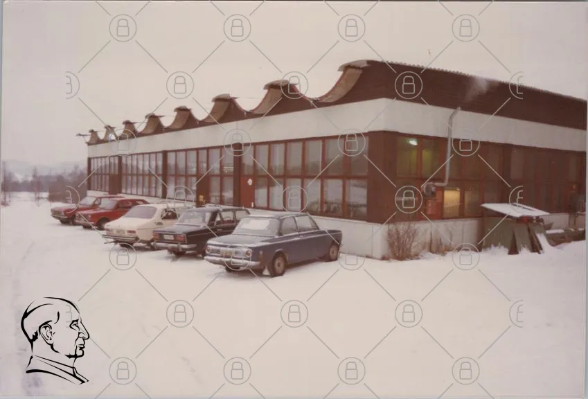 byggnad, fönster, snö, bilar, industri, tak, vinter, asfalt, parkering, kontor, gammal, grå, röd, exteriör, landskap, kallt, svensk, 1970-tal, retro, arkitektur