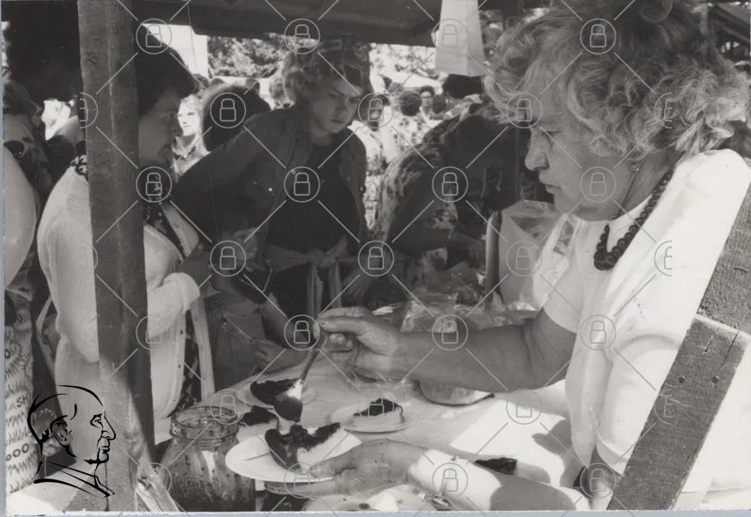marknad, människor, mat, försäljning, bakverk, sylt, bord, kläder, 1980-tal, fest, aktivitet, barn, kvinna, servering, tradition, utomhus, samling, hantverk, kultur, gemenskap, smakprov, handarbete, familj, glädje, socialt, evenemang, retro, nostalgisk, folkmassa, lokal