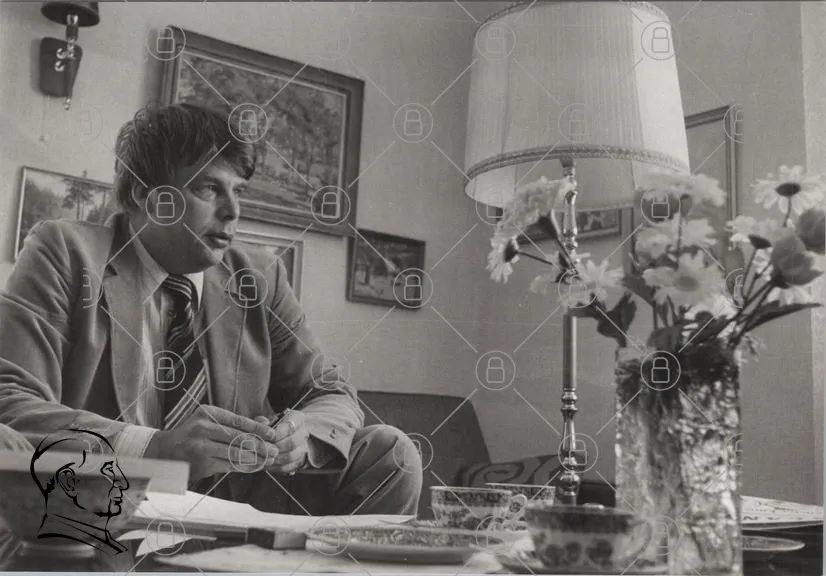 man, kontor, svartvitt, kläder, skrivbord, lampor, tavlor, blommor, te, koppar, dokument, möbler, 1970-tal, inredning, samtal, professionell, stil, avslappnad, uttryck, interiör