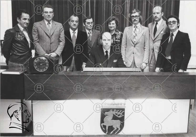 grupp, män, kvinnor, kostymer, svartvitt, möte, bord, klocka, emblem, 1970-tal, formell, affärsmän, ledarskap, presentation, bakgrund, fotografi, historia, professionell, samarbete, tradition, stil, kontor, diskussion, team, representation, myndighet, organisation, delegation, ansikten, kläder