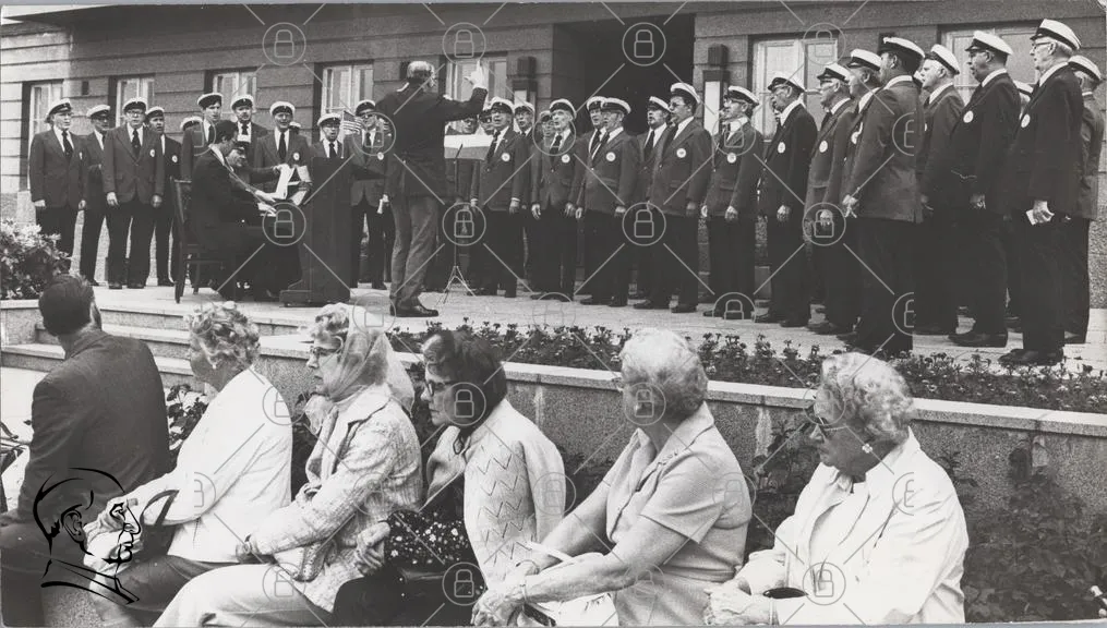konsert, kör, dirigent, publik, män, kvinnor, kläder, 1950-tal, svartvitt, musik, framträdande, evenemang, tradition, samling, utomhus, blommor, leenden, hattar, stolar, gemenskap, kultur, historia, fest, artister, uppträdande, glädje, samhörighet, minnen