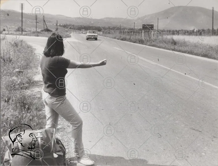 väg, hitchhiking, resande, bil, landskap, kvinna, ryggsäck, sommar, svartvitt, natur, trafik, stopp, avstånd, vägskylt, berg, vägkant, ensam, äventyr, frihet, ungdom, resa