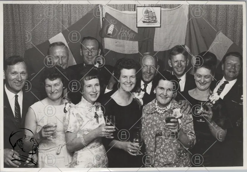 fest, människor, kläder, glas, leenden, svartvitt, 1960-tal, kvinnor, män, dekorationer, blommor, flaggor, samling, firande, porträtt, tradition, sällskap, glädje, minnen, festligheter