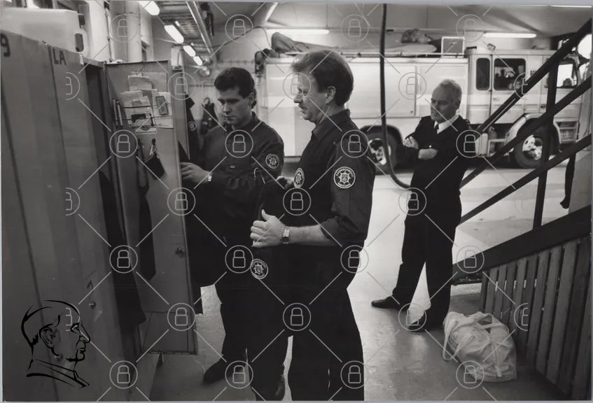 brandmän, omklädningsrum, uniformer, kläder, arbete, brandstation, män, svartvitt, samarbete, förberedelse, säkerhet, utrustning, kommunikation, gemenskap, professionell, fokus, uppgift, insats, brand, team, organisation, ansvar, rutiner, miljö, interaktion, stöd, ledarskap, erfarenhet, tradition, service