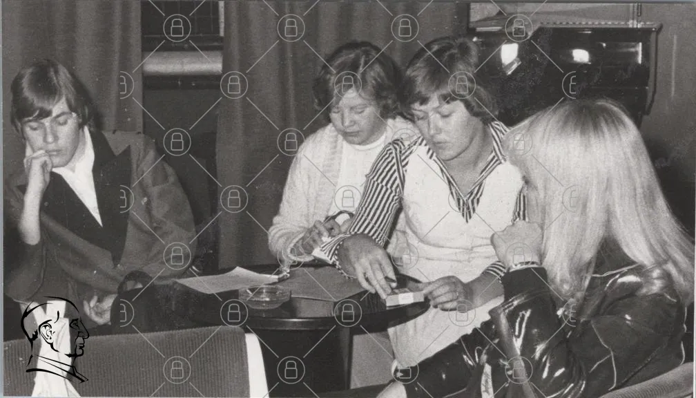 svartvitt, kvinnor, bord, samtal, kläder, 1970-tal, inomhus, café, dokument, anteckningar, glas, skratt, socialt, vintage, retro, stil, interiör, vänskap, uttryck, avslappnat, samling