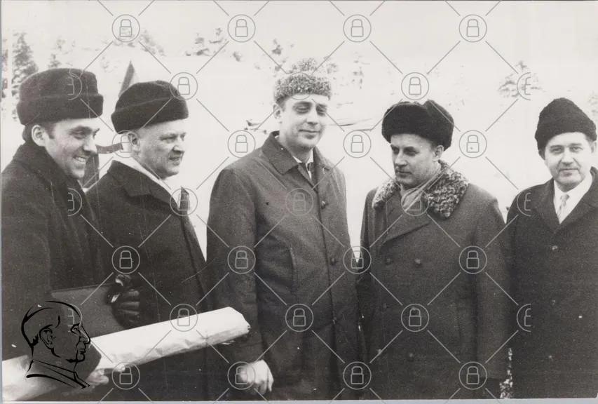 historisk, svartvit, män, mössor, vinterkläder, snö, ledare, politik, 1900-talet, gruppfoto, friluftsliv, kalla kriget, ryska, sovjetiska, kostymer, traditionella, vinter, samarbete, diplomati, mänskliga relationer