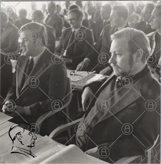 möte, konferens, män, kostymer, 1970-tal, svartvitt, diskussion, åhörare, bord, papper, anteckningar, formella kläder, grupp, politik, affärsmän, allvarliga, inomhus, samling, presentation, ledarskap, professionell, fokus, interaktion, ansiktsuttryck, kommunikation, samhälle, beslut, organisation, traditionell, stil