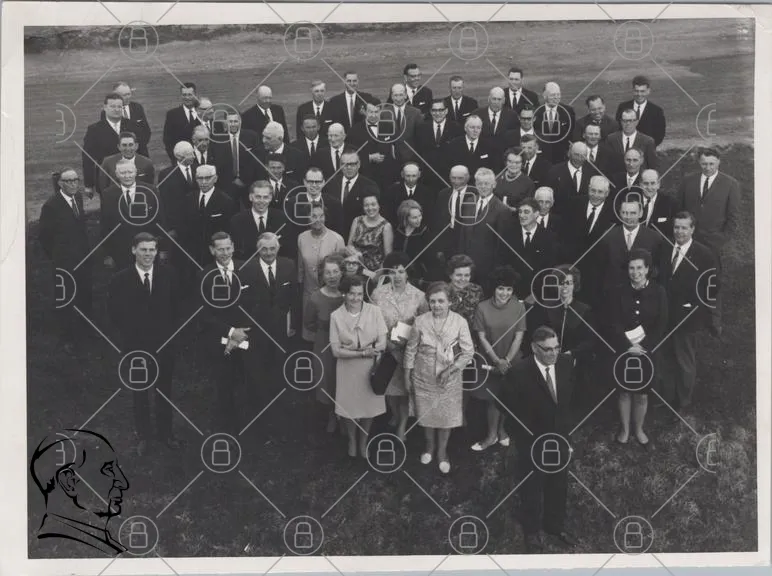 grupp, människor, svartvitt, foto, 1960-tal, kläder, kostymer, kvinnor, män, samling, utomhus, porträtt, ansikten, traditionell, formell, stil, leenden, bakgrund, gräs, stående, samarbete, evenemang, minnen, historia, generationer, familj, vänner, gemenskap, fest, jubileum