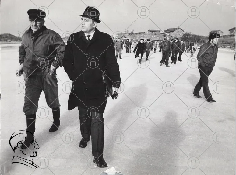 svartvit, is, människor, promenad, vinter, kläder, hatt, kostym, skor, landskap, friluftsliv, grupp, män, snö, tradition, 1960-tal, historisk, stad, aktivitet, socialt