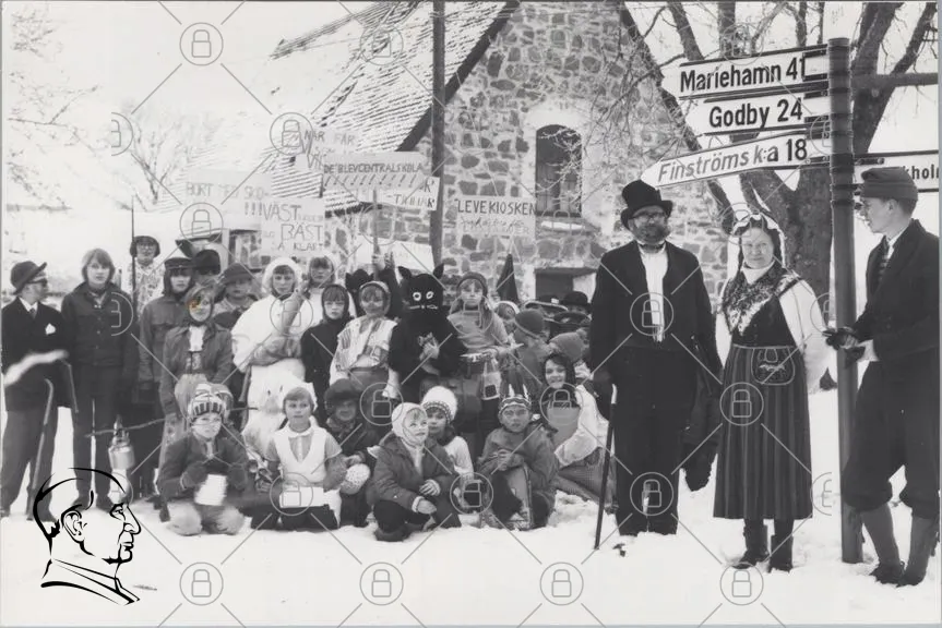 snö, barn, vuxna, kläder, traditionell, vinter, fest, Mariehamn, Godby, Finström, skyltar, svart katt, gammaldags, samling, fotografering, historisk, kultur, gemenskap, glädje, leenden, hattar, kjolar, vinterkläder, landskap, byggnad, träd, snölandskap, svartvitt, evenemang, folkmassa
