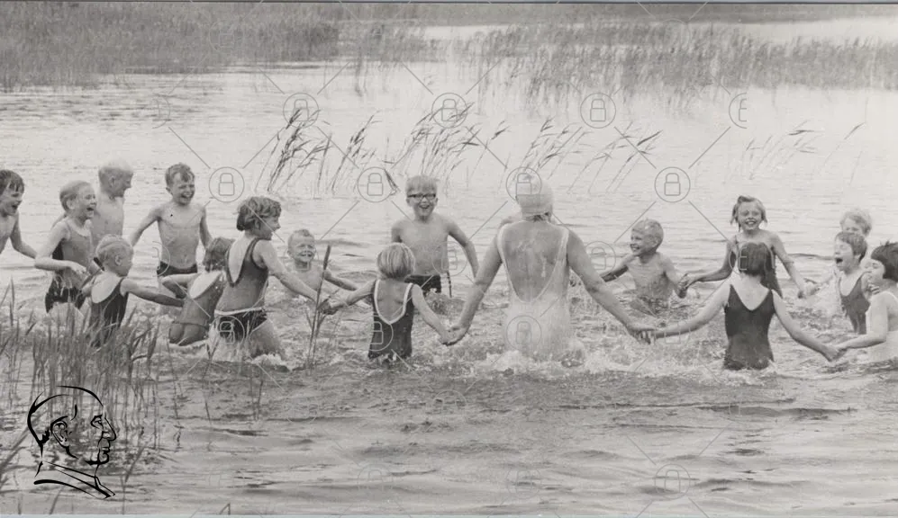 barn, simma, sjö, sommar, glädje, vatten, lek, natur, gräs, badkläder, svartvitt, familj, vänskap, skratt, aktivitet, tradition, minnen, roligt, gemenskap, fritid