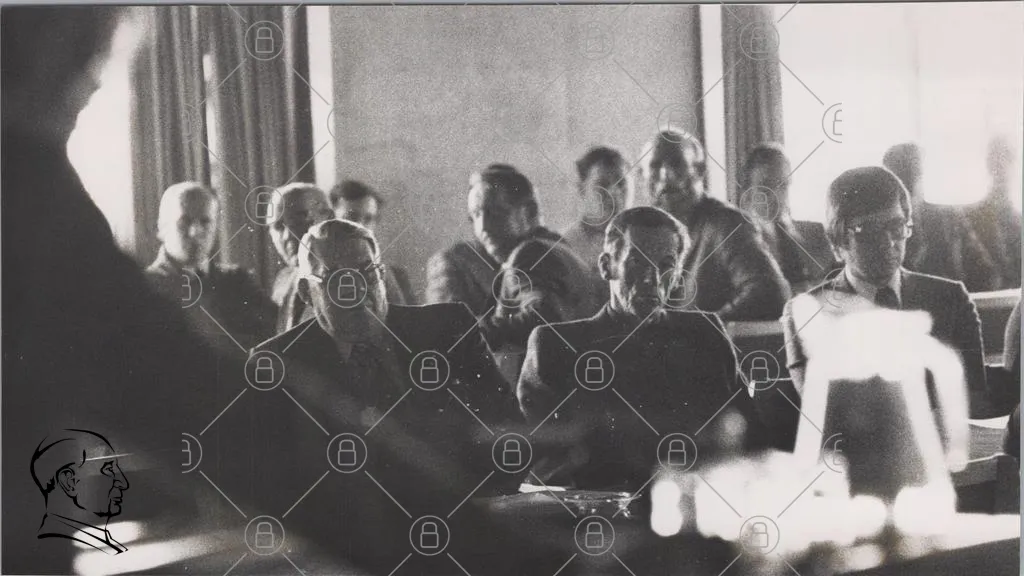 möte, män, diskussion, konferens, åhörare, kläder, ansiktsuttryck, inomhus, 1900-tal, svartvitt, allvar, fokus, sittande, grupp, samling, presentation, talare, bakgrund, ljus, skugga, interaktion, uppmärksamhet, traditionell, stil, professionell, samhälle, historia, kultur, kommunikation
