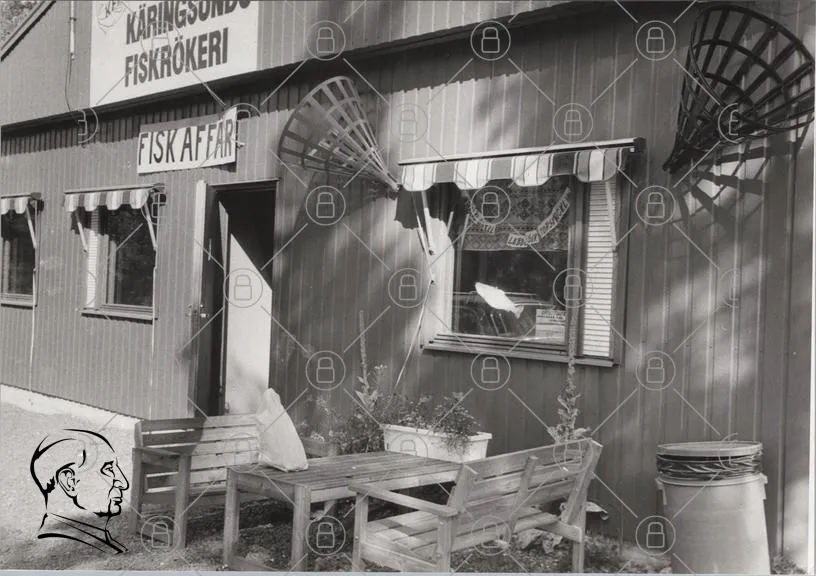 Käringsund, fiskrökeri, fiskaffär, butik, fönster, trä, bord, stolar, växter, skylt, utomhus, skugga, byggnad, landskap, svartvit, lokal, handel, mat, hav, fisk, tradition, svensk, kust, verksamhet, service, samhälle