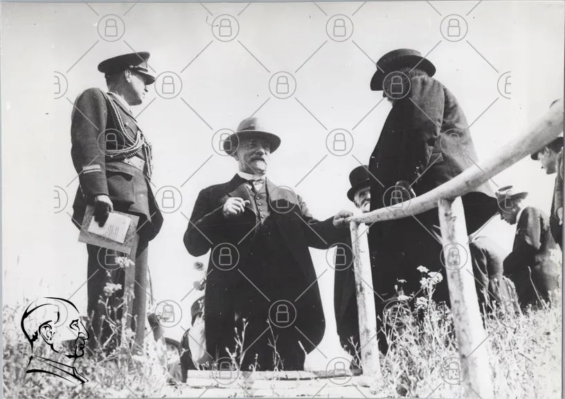 historisk, svartvit, män, kostymer, hattar, möte, utomhus, ledare, militär, diskussion, 1900-tal, fotografi, politik, samhälle, tradition, kläder, ansiktsuttryck, gestikulation, natur, bakgrund
