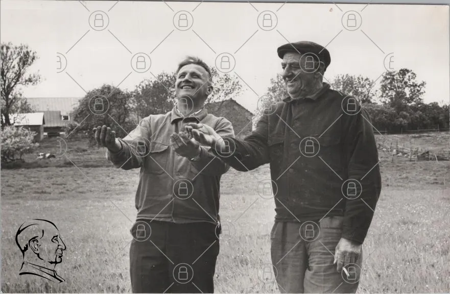 män, skratt, fält, natur, träd, svartvitt, landskap, vänskap, jordbruk, glädje, gammal, ung, tradition, samarbete, utomhus, porträtt, historia, kultur, arbete, gemenskap