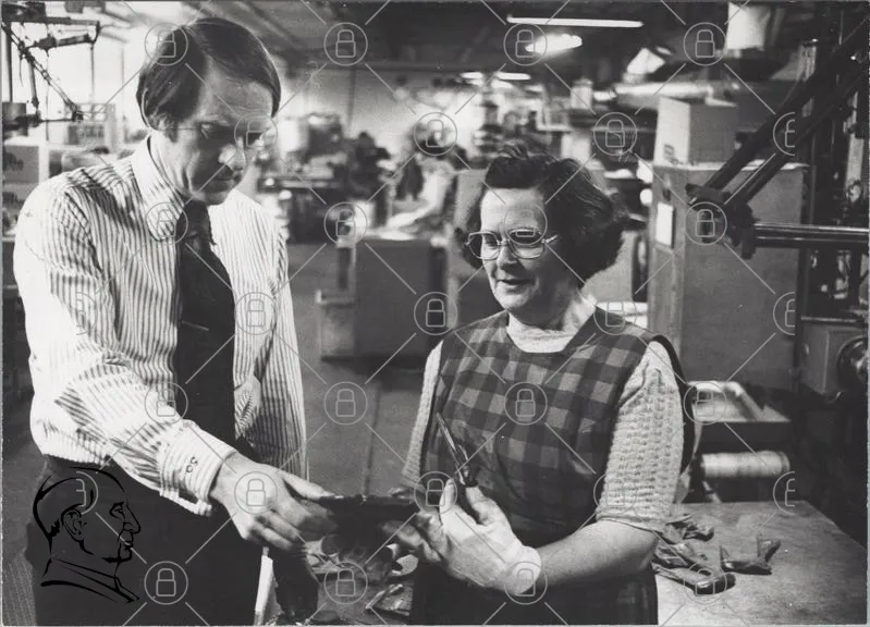 man, kvinna, fabrik, arbete, 1970-tal, svartvitt, kläder, verktyg, samarbete, industri, produktion, kontor, glasögon, handskar, maskiner, arbetsmiljö, teknik, retro, professionell, interaktion, team, arbetsplats, traditionell, hantverk, människa, arbetskraft, erfarenhet, fokus, detaljer