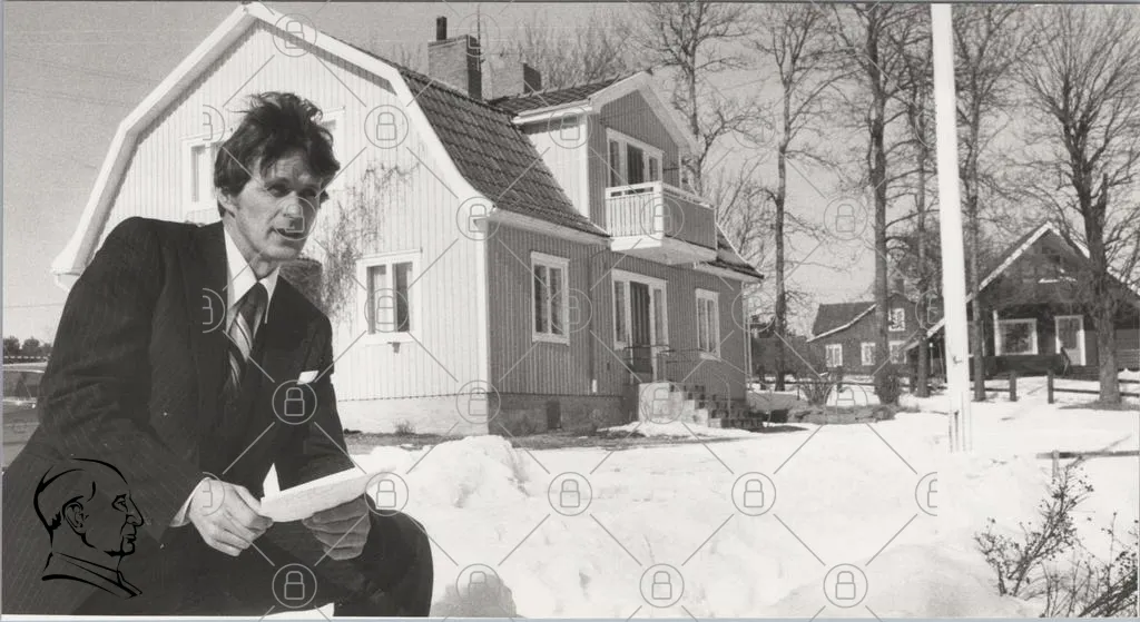 man, kostym, snö, hus, vinter, svartvitt, träd, utomhus, byggnad, landskap, stil, 1960-tal, fotografi, porträtt, svensk, natur, arkitektur, traditionell, miljö, gatan, stillhet, ensam, snölandskap, kläder, ansiktsuttryck, bakgrund, historia, kultur, tidsepok