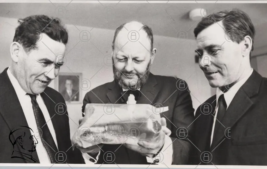 fisk, glasbehållare, män, svartvitt, vetenskap, forskning, presentation, akvarium, laboratoriemiljö, 1970-tal, bevarande, marinbiologi, experiment, observation, vatten, art, studie, forskningsteam, akademiker, intresse